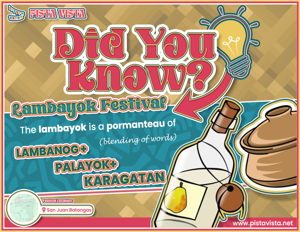 The Lambayok Festival in San Juan, Batangas began to commemorate the municipality’s founding day on December 12. The term “Lambayok” is a portmanteau of the three main industries that represent the town: Lambanog (coconut wine), produce in many barangays, Palayok, Filipino clay pots used in cooking produced in the area; and Karagatan (the sea), representing the fishing industry.