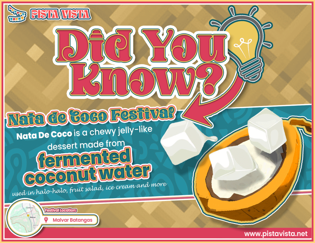 During the celebration, visitors can expect a showcase of nata de coco in many forms: from traditional jelly desserts and fruit salads, to creative new dishes and beverages featuring the local specialty. The festival also invites producers to demonstrate the process of making nata de coco, giving a behind-the-scenes look at the craftsmanship involved. Cultural performances, parades, and festive displays round out the event, giving a lively atmosphere that celebrates local flavor and communal pride.