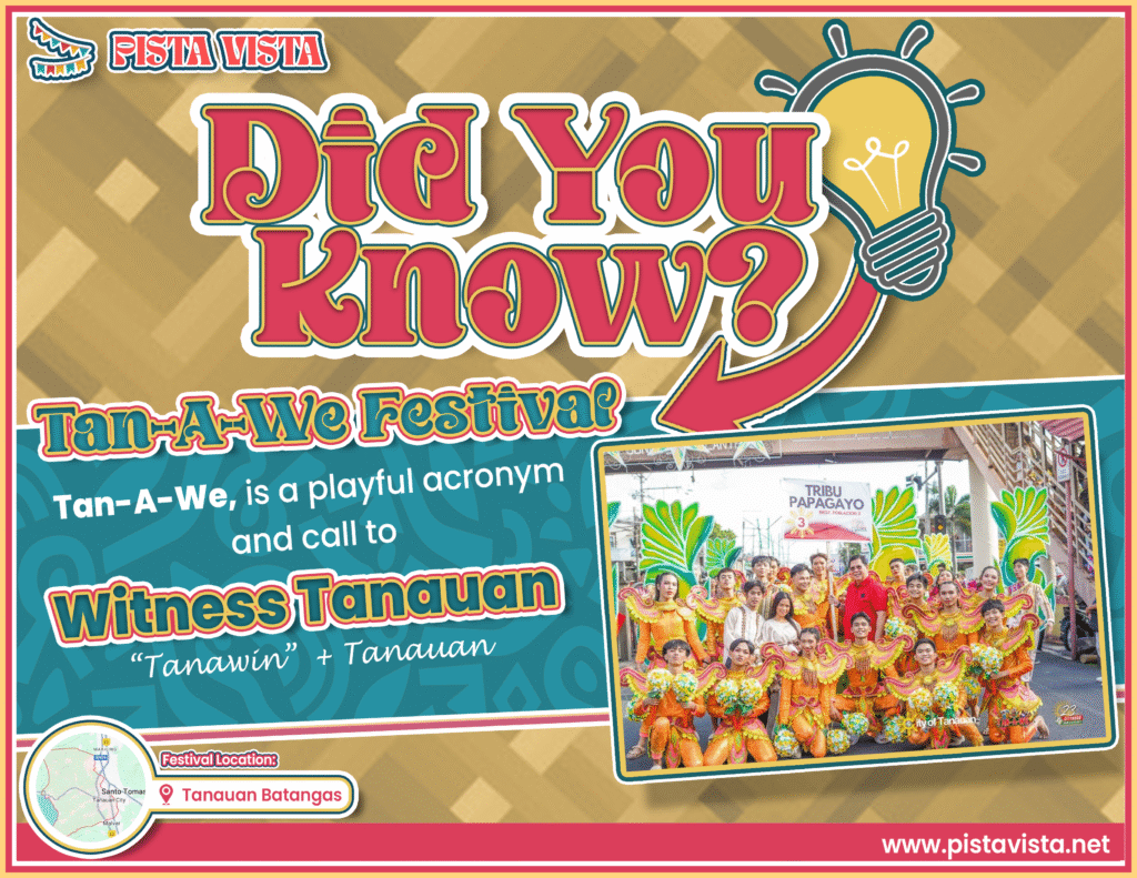 The Tan-A-We Festival is held every March 10 in Tanauan City. The name “Tan-a-we” comes from the Batangueño term tanaw-e, derived from tanaw, meaning “to look through.” The festival pays tribute to Tanauan’s historic role of watching over trade and travel—its identity linked to its vantage point by the waterways and land routes leading into the town. The event is also aligned with Tanauan’s cityhood anniversary and sets a tone of unity, progress and growth for the local community.